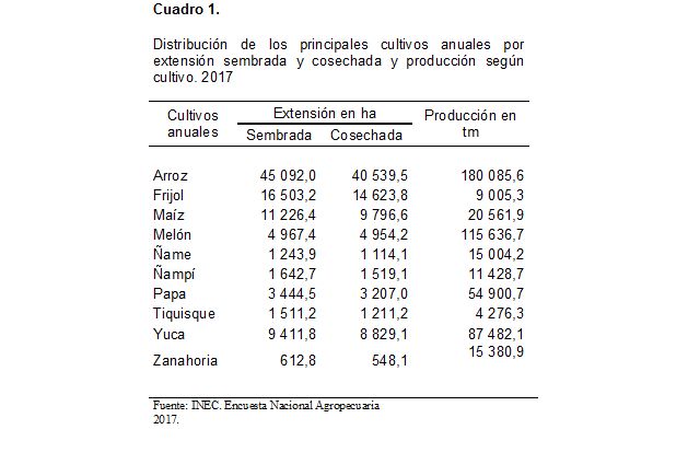 Entre los principales cultivos anuales investigados se incluyen arroz, frijol, yuca, melón y maíz.Con relación al arroz para el período 2017 se estima que se sembraron 45 092 hectáreas (ha) de arroz y se cosecharon40 540 ha. (Ver cuadro 1). Por su parte la producción estimada fue de 180 086 toneladas métricas (tm), de ella, la mayor parte (el 85,6%) fue destinada a la venta.