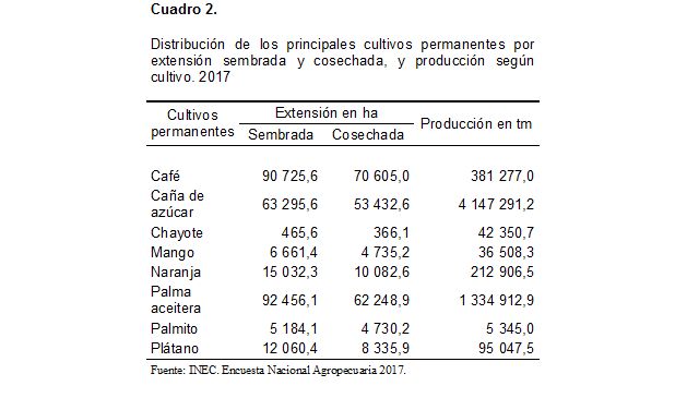 Los cultivos de café y caña de azúcar, tradicionalmente han presentado grandes extensiones sembradas en el país; donde para 2017 se registraron 90 726 ha y 63 296 ha, respectivamente. En el caso del café se estimó un área cosechada de 70 605 ha con una producción de 381 277 tm; mientras que, en el caso de la caña, los datos de cosecha fueron 53 433 ha y una producción de 4 147 291 tm. Ambas actividades destinaron mayormente su producción a la comercialización.