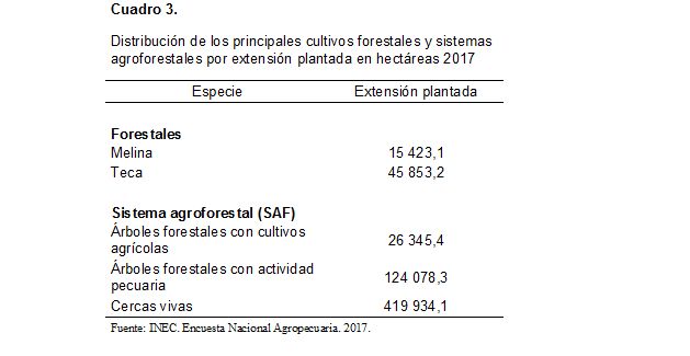 Al valorar las prácticas agrícolas, se observó que los abonos químicos se usan, en promedio, en el 80,2% de las fincas con cultivos permanentes.Por otro lado, se encuentra que la mayor parte de las fincas con cultivos permanentes no utilizó sistemas de riego. Sin embargo, para el caso de las fincas de caña de azúcar, el principal sistema utilizado es riego por gravedad. Cultivos forestalesLos cultivos forestales, tienen como objetivo principal, pero no único, la producción de madera, y entre ellos la ENA investigó la teca y la melina, los cuales son los que tienen la mayor extensión plantada en el país. Se investigaron, además los sistemas agroforestales (SAF) que son formas de usar la tierra mediante la combinación de especies forestales, en tiempo y espacio, con cultivos agrícolas o actividades pecuarias. Su importancia radica en que proporcionan múltiples beneficios ambientales y protegen la diversidad de especies vegetales y animales.