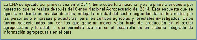 La Encuesta Nacional Agropecuaria 2017 (ENA) reveló información de cultivos agrícolas y forestales sobre las áreas sembradas, cosechadas, la producción, destinos de la producción y prácticas agronómicas de cultivos anuales, permanentes y forestales.